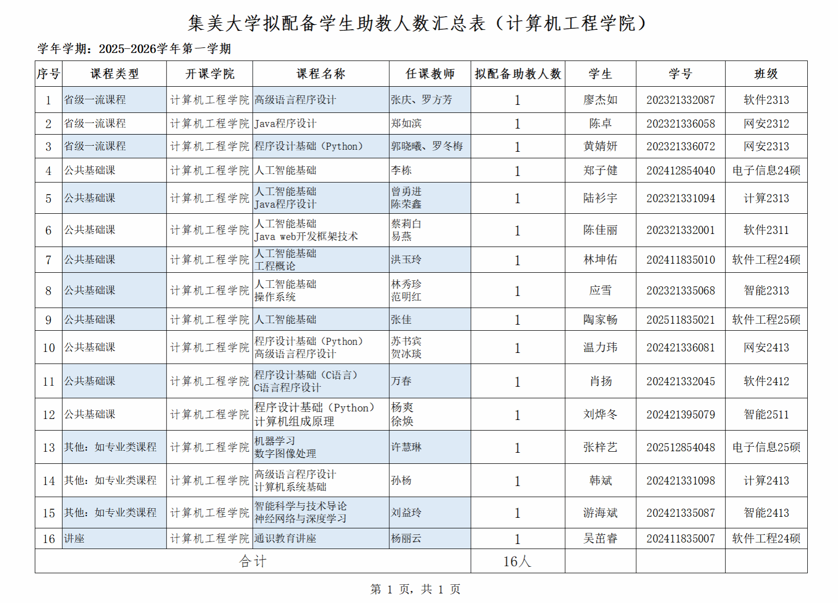 关于公布2025-2026学年第一学期计算机工程学院拟招聘学生助教的名单