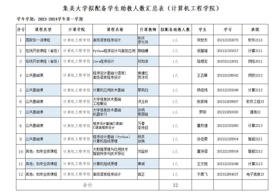 根据《集美大学本科课程学生助教岗位设置与管理办法(试行)》(教务〔2020〕11号)及《2023-2024学年第一学期计算机工程学院关于招聘部分课程学生助教的通知》精神,经过学生报名及面试,现将拟招聘结果公布如下: