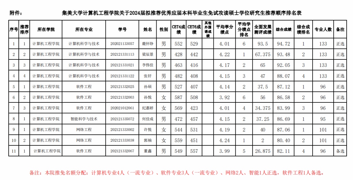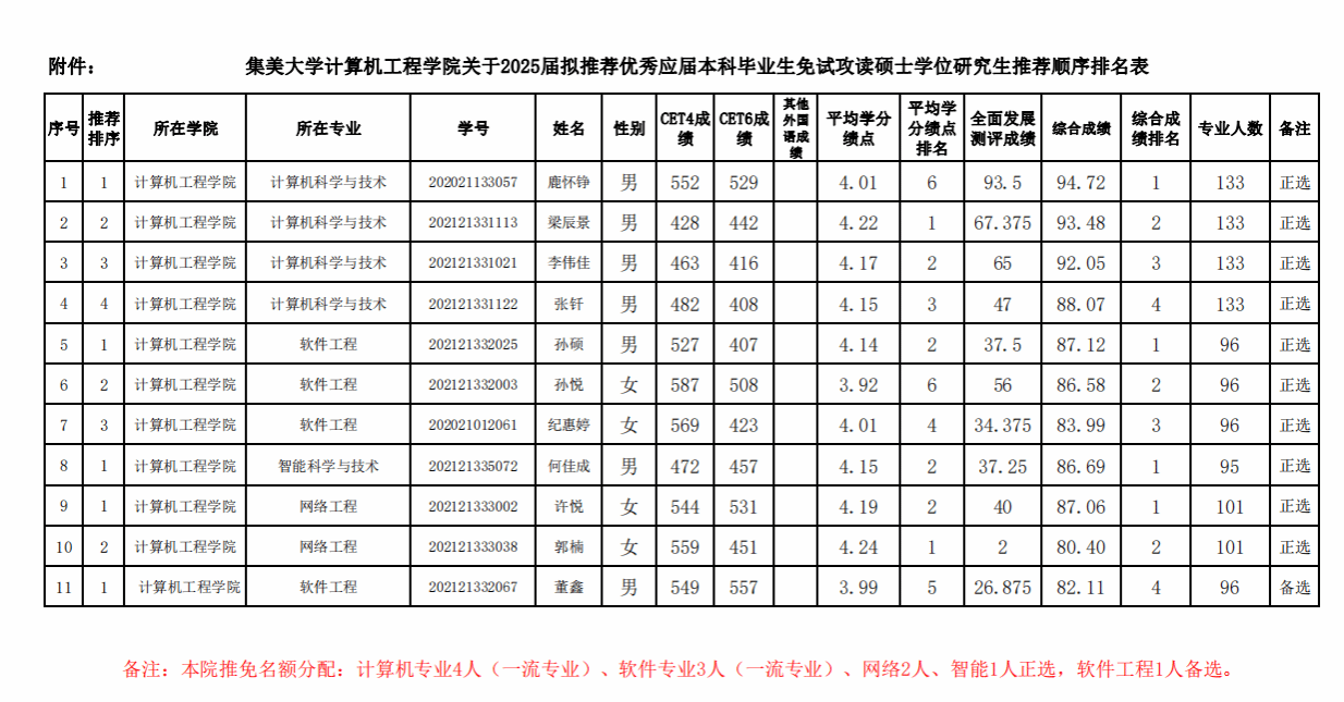 根据《关于做好2025届推荐优秀应届本科毕业生免试攻读硕士学位研究生工作的预通知》(集大教〔2024〕40号文) 及《关于做好2025届推荐优秀应届本科毕业生免试攻读硕士学位研究生工作的预通知》(集大计算机院〔2024〕12号文)的文件精神,并结合我院实际情况,组织了我院2025届推免生报名工作。学院推免工作遴选小组根据学校和学院的推免文件材料,对申请人资格和成果证明材料进行了审核,计算学生的综合成绩,并按专业按照成绩由高到低进行排序。现将集美大学计算机工程学院2025届拟推荐免试攻读硕士学位研究生名单予以公示(见下表):