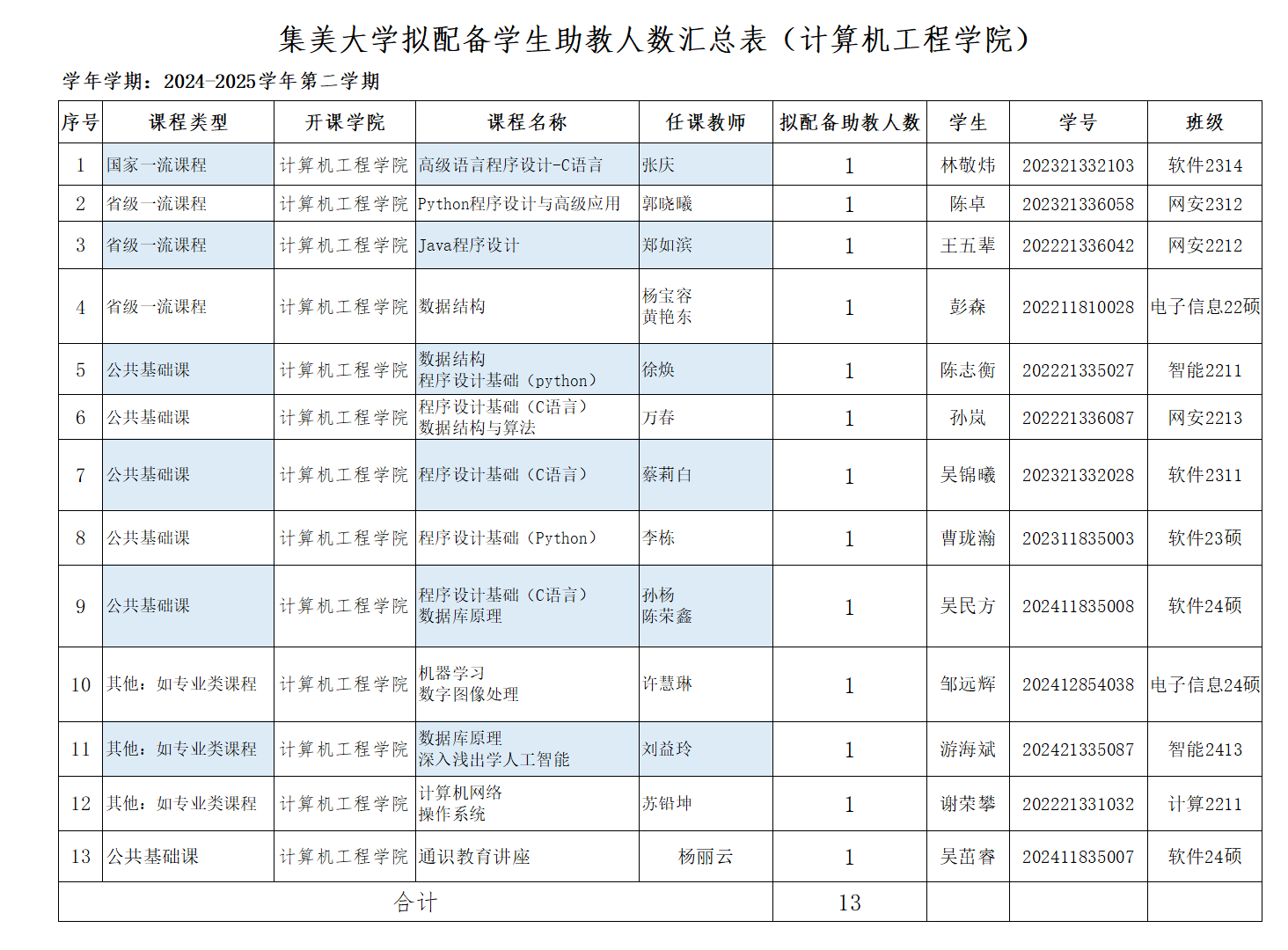 关于公布2024-2025学年第二学期计算机工程学院拟招聘学生助教的名单